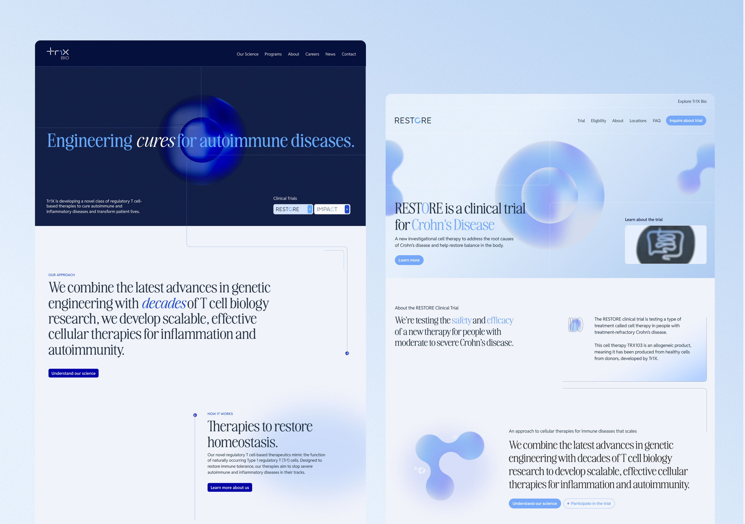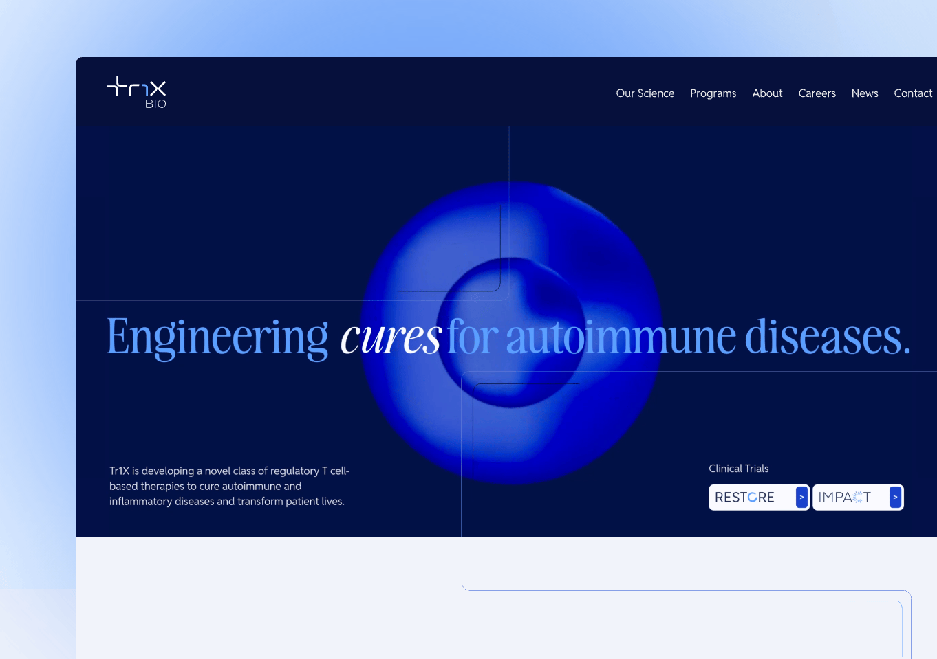 Tr1X Bio needed to speak to two very different audiences: investors evaluating a first-in-class cell therapy, and patients exploring clinical trial eligibility. The visual problem was real. Those two audiences needed to feel like they were in different places, but the brand still had to hold together as one company.